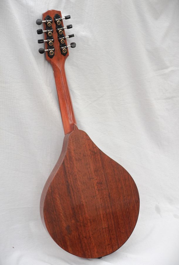 This mandolin is a 4th generation flattop mandolin. It has a very lightweight top, braced similar to a classical guitar but with carbon fiber reinforcement. The top is about 30% lighter and gives more volume and improved tone. It has a Jarrah back, sides and neck. This mandolin is very resonant and responsive, and loud with a strong ring.
